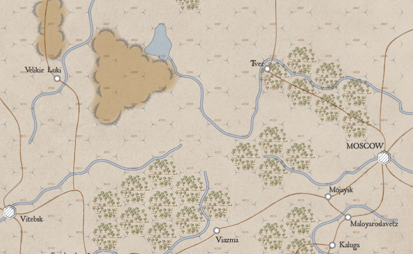 1812 is a strategic scale game on the French invasion of Russia in 1812. Leaders expend command points in order to move and operate corps and divisions. Each hex is approximately 25 miles, and each turn is 2 weeks. The French player must carefully manage supply points while attempting to capture Russian units and cities before they are evacuated and/or burned. The Russian player must weigh spending VPs on extra units against the growing impatience of the Russian public to drive the French out of Russia.